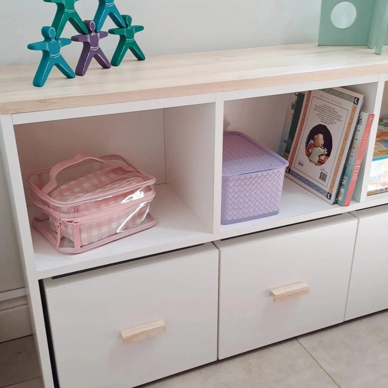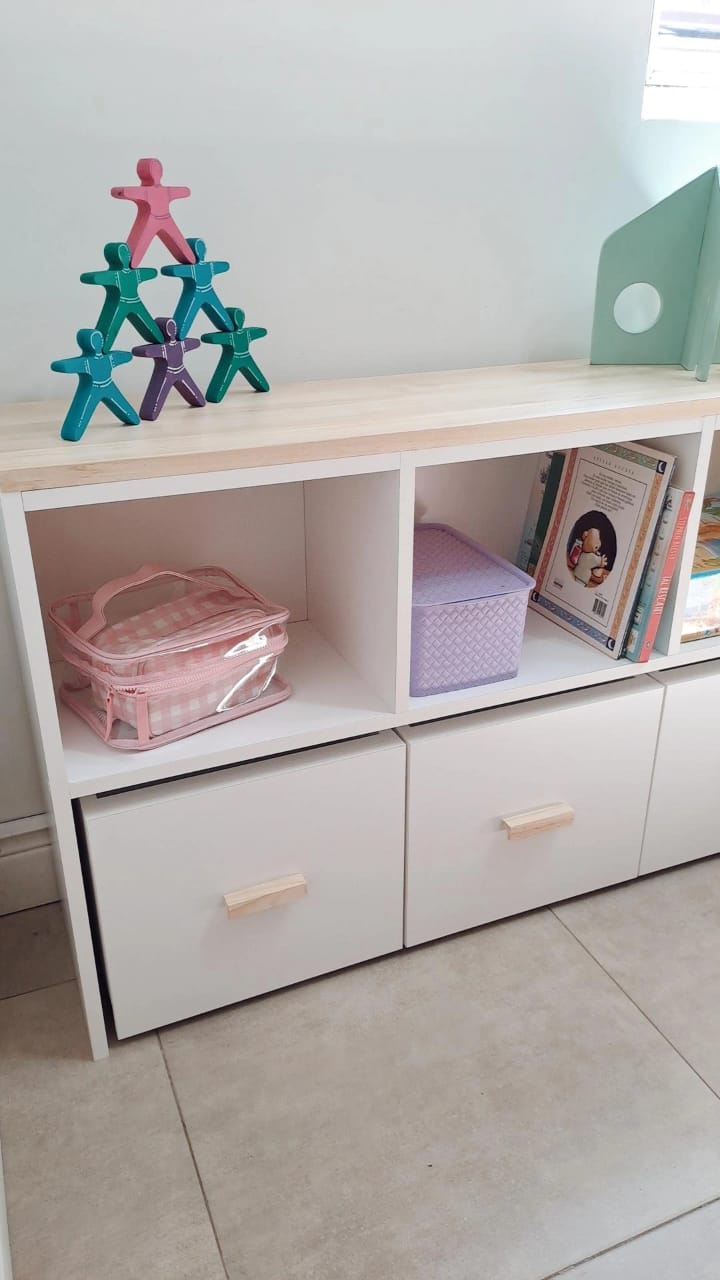 Con 3 cubos y 3 cajones con ruedas. Todo realizado en melamina blanca(con cantos de PVC)